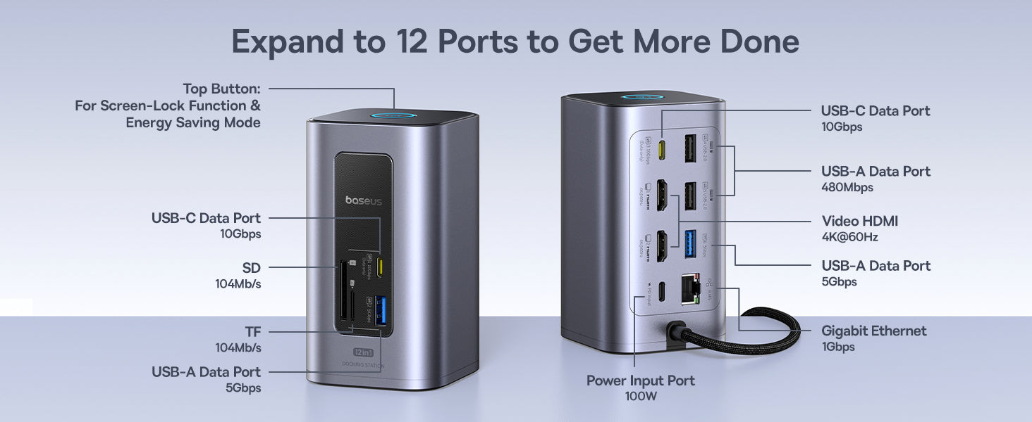 Ši 12-in-1 USB-C doko stotis supaprastina darbo vietą. Ji turi du HDMI 4K išėjimus, 6 USB prievadus, palaiko iki 10 Gbps perdavimo greitį, 100 W PD įkrovimą, Gigabit Ethernet. Dvigubas 4K padidina našumą, o išmanusis režimas išlaiko nešiojamojo kompiuterio įkrovą.