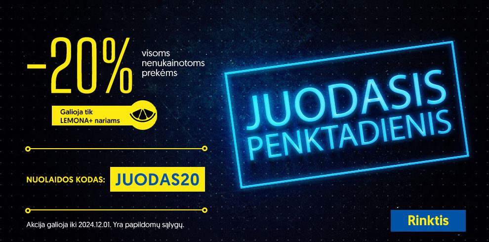 Pasinaudok nuolaidos kodu JUODAS20, kuris visoms nenukainotoms prekėms suteiks -20% nuolaidą. Nuolaidos kodas galioja tik LEMONA+ lojalumo programos dalyviams. Pasiūlymas galioja tik sandėlyje esančioms nenukainotoms prekėms, nuolaidos nesisumuoja.
