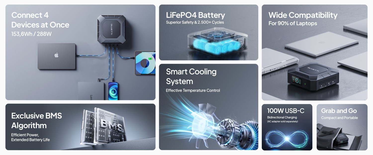 - Dvikryptis įkrovimas: 100 W USB-C prievadas leidžia vienu metu įkrauti ir iškrauti, todėl jūsų įrenginiai bus įkrauti be pertraukų.